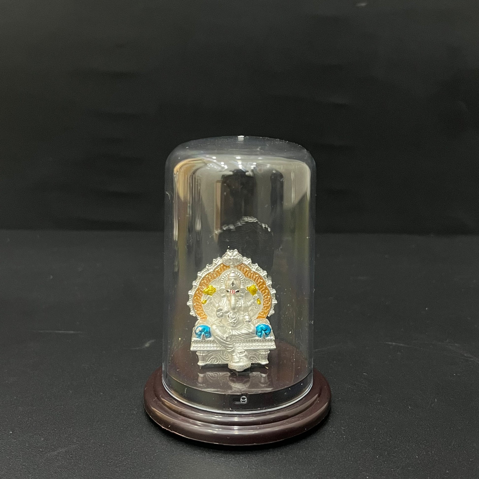 Bring home the blessings of Lord Ganesha, the remover of obstacles, with this beautifully crafted pure silver idol. Enclosed in a transparent glass cover, it stays protected while radiating divine charm and positivity. Perfect for pooja rooms, temples, home décor, festive occasions, and gifting.